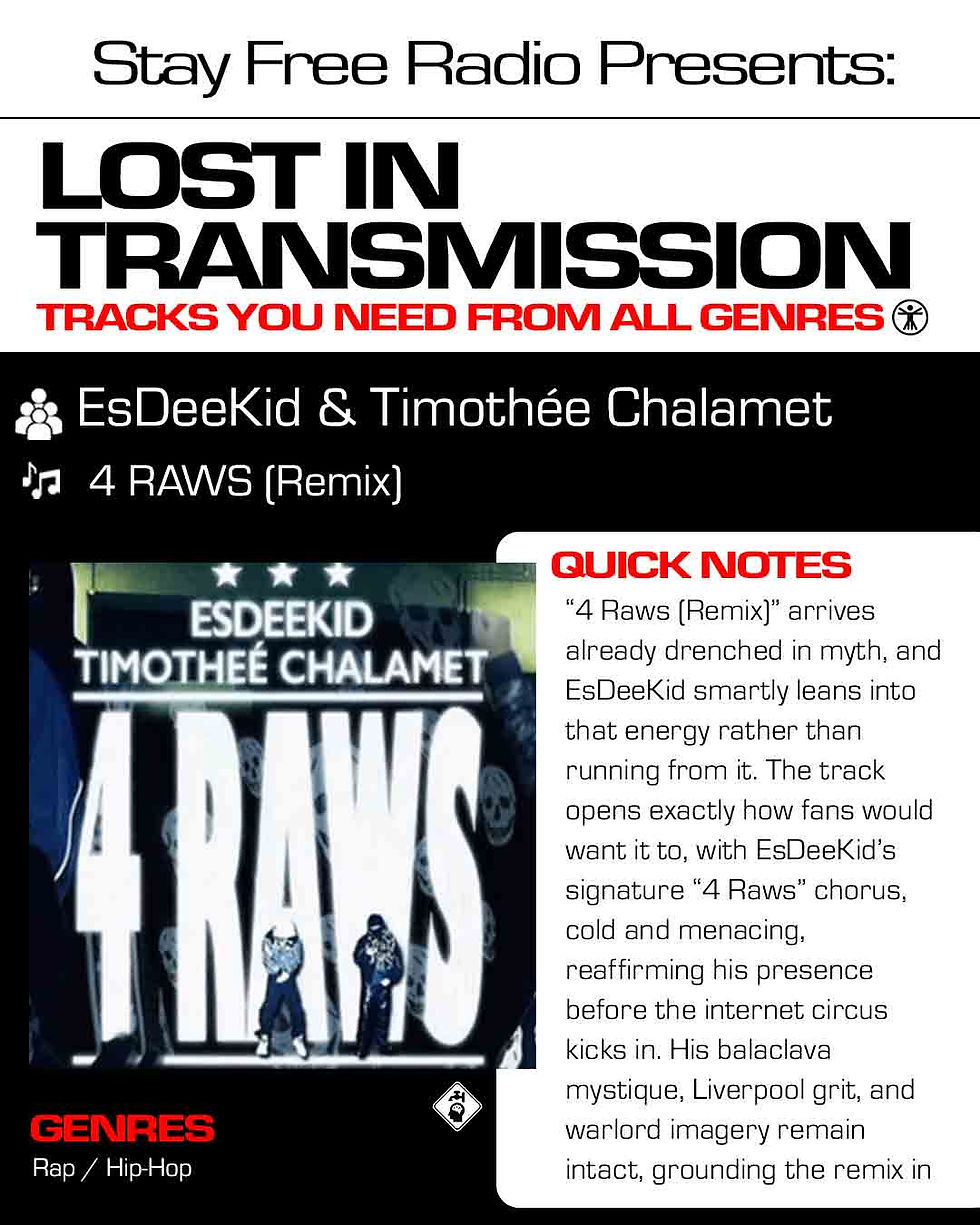 “4 Raws (Remix)” arrives already drenched in myth, and EsDeeKid smartly leans into that energy rather than running from it. The track opens exactly how fans would want it to, with EsDeeKid’s signature “4 Raws” chorus, cold and menacing, reaffirming his presence before the internet circus kicks in. His balaclava mystique, Liverpool grit, and warlord imagery remain intact, grounding the remix in the same grimy world as the original. That choice matters because it frames Timothée Chalamet not as the main event, but as a guest stepping into EsDeeKid’s universe.